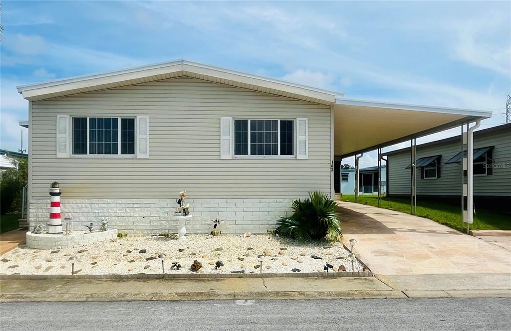 Spacious and unique 3 bedroom/2 bath double wide manufactured home. This large home offers 1464 living area square footage and sought after split floor plan offering both space and privacy. Step inside to an open and airy layout that includes the primary suite on one side and the guest bedrooms on the other. Large eat in kitchen, dining room, and a welcoming living room with vaulted ceilings and a fireplace. Laundry located inside the home. Enjoy indoor-outdoor living with a screened side porch, covered 2 car covered driveway, and maintained landscaping. This move in ready home is located in Blue Jay Estates, an active 55+ community where you own your land! It is situated in a non-flood zone and there is no lot rent! A low monthly fee of $230 a month includes escrow reserves, water, sewer, trash, lawn care, and more! Schedule your showing today. Blue Jay has a very active social club, lots of activities, a heated pool for year-round enjoyment, shuffleboard and Bocce courts. There is a designated area where you can park your boat or R/V at no additional fee if space is available when requested. Near beaches, the Pinellas trail, parks, shopping, medical centers, and airports